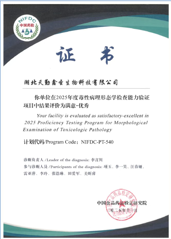 毒性病理形態學檢查是藥物臨床前毒理學評價的重要環節。為在毒性病理診斷領域持續保持高水平,天勤生物全資子公司湖北天勤鑫圣生物科技有限公司(以下稱“天勤鑫圣”)參加了由中國食品藥品檢定研究院組織的2025年度毒性病理形態學檢查能力驗證項目(NIFDC-PT-540),結果評價再次榮獲“優秀”。