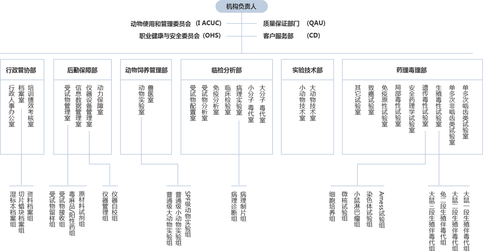 實驗動物飼養與觀察室總面積3000㎡,主要包括800㎡嚙齒類SPF級實驗動物屏障系統,200㎡嚙齒類普通級實驗觀察室,1000㎡非嚙齒類Beagle犬普通級實驗及觀察室及1000㎡非人靈長類普通級實驗及觀察室,飼養動物類型涵蓋小鼠、大鼠、豚鼠、家兔、Beagle犬、非人靈長類。依照中國《 實驗動物管理條例》和美國《實驗動物飼養管理和使用手冊》(The Guide for the Care and Use of Laboratory Animals)等法律法規,由實驗動物管理與使用委員會(IACUC)負責監督動物使用和飼養,通過定期檢查、規范流程、實施培訓,以保障專業規范和較高水平動物福利。