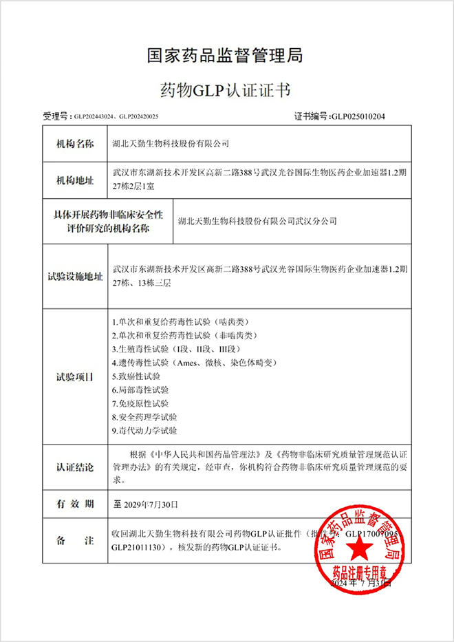 日前,國家藥品監督管理局對湖北天勤生物武漢分公司(以下稱“天勤生物武漢分公司”)執行《藥物非臨床研究質量管理規范》(以下稱GLP)的情況進行了為期1周的定期現場檢查,結果均順利通過。 為確保用藥安全,GLP是藥物非臨床評價研究必須遵循的一套嚴格質量管理體系。檢查組專家對天勤生物武漢分公司的組織機構與人員、實驗設施與管理、儀器設備和實驗材料、標準操作規程、資料檔案五大核心模塊進行了全面檢查,重點查驗了非臨床研究原始數據的真實性、可靠性、可追溯性,結果均符合GLP要求。這標志著天勤生物質量管理體系的高度依從性。 自2017年開始,天勤生物便開始參照GLP準則,建立評價研究體系。作為湖北省第一家民營GLP研究機構,也是中部地區GLP認證資質最全的機構,天勤生物武漢分公司擁有超過10000m2的試驗設施,滿足國內、美國FDA、歐盟OECD、澳洲TGA等GLP標準,服務涵蓋單次和重復給藥毒性試驗(嚙齒類)、單次和重復給藥毒性試驗(非嚙齒類)、生殖毒性試驗(I段、II段、III段)、遺傳毒性試驗(Ames、微核、染色體畸變)、致癌性試驗、局部毒性試驗、免疫原性試驗、安全藥理學試...
