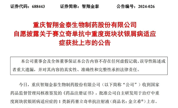 天勤生物助力智翔金泰的賽立奇單抗注射液獲批上市