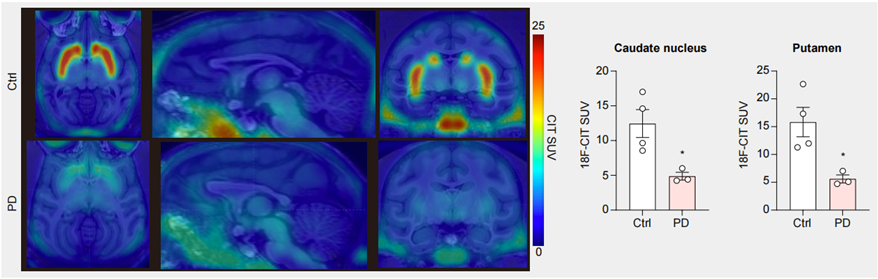 圖3. PET-CT結果顯示PD模型猴腦中多巴胺神經元減少